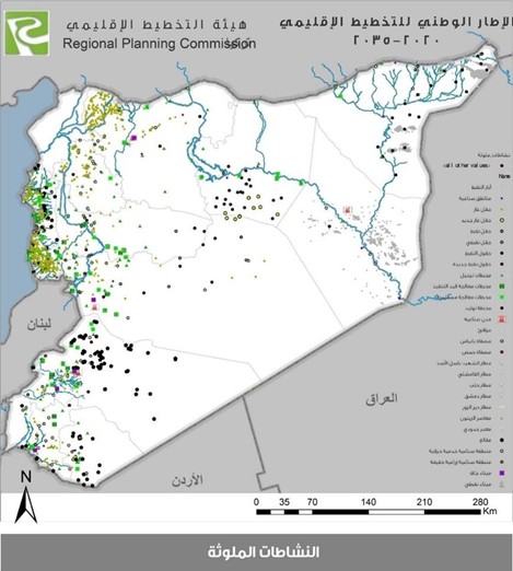 أما بالنسبة لمقترحات استراتيجية التنمية المكانية تظهر الخريطة التالية الوضع البيئي المركب لبؤر التلوث الجديدة الناتجة عن توضع المشاريع الاستراتيجية المستقبلية.