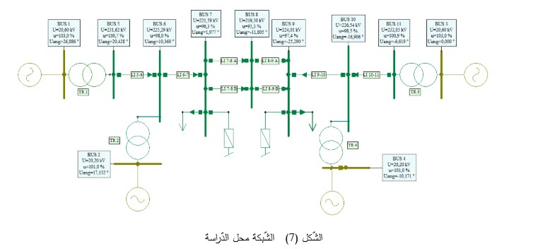 بناءً على الأُسس النّظرية التي نوقشت في الأقسام السّابقة والنّموذج الرّياضي لعناصر نظام القدرة، أُجريت دراسة محاكاة ديناميكية للنّظام المُوضّح في الشّكل (7) باستخدام برنامج NEPLAN. للحصول على بيانات المُولّدات والمُحولات، فيمكن الرّجوع إلى المثال في البرنامج المذكور. يَظهر في الشّكل (7) نتائج جريان الحمولة.