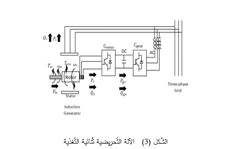 إنّ الآلة التّحريضية ثُنائية التّغذية في وضع المُولّد تكون نفسها المُولّد التّحريضي ذو الدّائر الملفوف ثلاثي الأطوار، حيث يتم توصيل ملفات الدّائر بثلاث حلقات انزلاق. يتم تغذية ملفات الدّائر في المُولّد التّحريضي بأنظمة جهد وتردد مُتغيرة ثلاثية الأطوار، وذلك عبر مُبدلات إلكترونية، والتي تكون موصولة عادةً بنفس الشّبكة الكهربائية المُتصلة بها ملفات الجزء الثّابت كما هو موضح في الشّكل (3). يُستخدم المُبدل الموصول مع جهة الشبكة لملفات الدائر للحفاظ على قيمة توتر ثابت في دارة التوتر المستمر (DC-Link)، بالإضافة إلى أنه يسمح بحقن أو سحب الاستطاعة الردّية. أما المُبدل من جهة العنفة الرّيحية فيستخدم بالتحكم بالاستطاعة الكهربائية المُولّدة من العنفة، حيث يتميز المُوّلد هنا بقدرته على العمل في نطاق سرعات يتراوح بين ±30%من السرعة التزامنية. هذا يتيح استخلاص أقصى طاقة ممكنة من الرياح حتى عند سرعات الرياح المنخفضة. إن أكثر ما يُستخدم من العناصر في المُبدلات الالكترونية هي العناصر الترانزستورية (IGBT) التي تُمكّن من تخفيض التوافقيات المحقونة في الشبكة، بالإضافة إلى التحكم المرن بالاستطاعة. يمكن لهذا المُولّد أن يعمل في كلتا الحالتين: فوق وتحت السّرعة التّزامنية ويكمن الاختلاف بين وضعي التّزامن في أن الطّاقة الكهربائية المُقدمة للشّبكة هي نفسها في كلتا الحالتين، مع العلم أنه في حالة التّشغيل تحت السّرعة التّزامنية، سيتم تغذية الدّائر من الشّبكة ويكون حقن الاستطاعة عبر الجزء الثّابت، ولكن في حالة التّشغيل فوق السّرعة التّزامنية، يكون حقن الاستطاعة في الشّبكة عبر الجزء الثّابت والدّائر معاً ولذلك سُمّي بالمُولّد ثُنائي التغذية (المرجع السّابق).