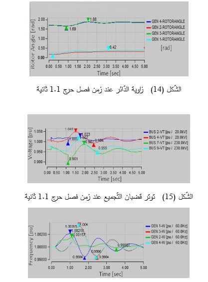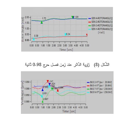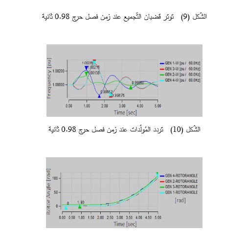 يبلغ زمن الفصل الحرج بعد تطبيق عطل ثلاثي الأطوار على الخط الواصل بين قضيب التّجميع الثّامن والتّاسع 0.98 ثانية. كما هو واضح من الشّكل (8)، فإن هذا العطل لا يؤثر بشكل كبير على استقرار زاوية الدّائر، حيث يبقى الاستقرار الزّاويّ مضموناً. يُوضّح الشّكل (9) بعض توترات قضبان التّجميع. لا يؤثر العطل المذكور على استقرار التّوتر أيضاً. يُوضّح الشّكل (10) سرعة المُولّدات والتي يظهر منها تزامُنها على الرّغم من أنها تتأرجح في نطاقات مختلفة بسبب اختلاف مُحدداتها، لكنها تظل متزامنة وقريبة من السّرعة الاسمية.  سيصبح النّظام غير مستقر بعد هذا الزّمن، كما هو موضح في الأشكال (11) و (12) و (13).