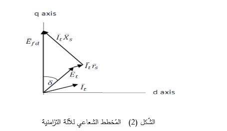 يُوضّح الشّكل (1) الدائرة المكافئة للآلة التّزامنية. كما تصف المُعادلة الآتية الآلة التّزامنية ذات الدّائر الأسطواني في الحالة المستقرة ويُوضّح الشّكل (2) المُخطط الشّعاعي لها. يمكن الاطّلاع على الّنموذج الرياضي الكامل لها في الحالة العابرة في المرجع الوارد على الهامش.