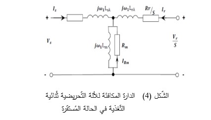 يوضح الشّكل (4) الدّارة المكافئة للمُولّد التّحريضي ثُنائي التّغذية في الحالة المستقرة. يمكن إيجاد النّموذج الرّياضي الكامل له في الحالة المستقرة والعابرة والنّموذج الرّياضي للمُحولة والنّموذج الرّياضي لخط النّقل بالتّفصيل في المرجع السّابق.