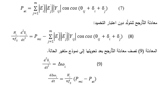 في دراسات الاستقرار العابر، ينصب الاهتمام على مقدار انحراف سرعة الدائر عن السّرعة الزّاويّة التّزامنية ωs. وبالتّالي، تُعطى معادلة التّأرجح الزّاويّ النّسبي (d2δ) /dt بدلالة الطّاقة الميكانيكية Pm التي توفرها العنفات، والطّاقة الكهربائية Pe وثابت العطالة H كما في (2) (حمزة، علي، زيدان، خالد (2007)).