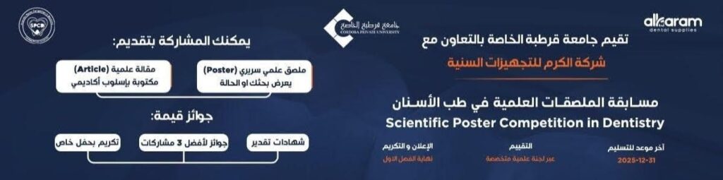 حلب – انطلاقاً من سعيها لدعم الإبداع العلمي والتميز الأكاديمي في المجالات الطبية، أعلنت كلية طب الأسنان في جامعة قرطبة الخاصة عن إطلاق مسابقتها الأولى للملصقات والمقالات العلمية لطلاب طب الأسنان للعام 2025.