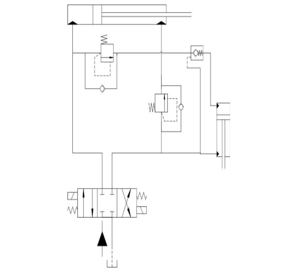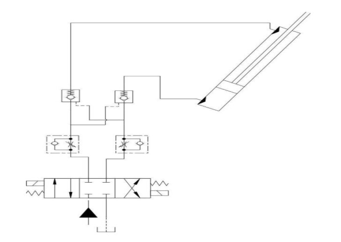 2- الأسطوانات المساعدة لذراع التوزيع: وهي المسؤولة عن إعطاء الذراع بعناصره (مقاطعه الجزئية) الوضعية المناسبة للعمل وتتحكم بالزاوية بين كل عنصرين متتالين من الذراع، ويكون عددها موافقاً لعدد مقاطع الذراع. هذه الأسطوانات من حيث التصميم هي اسطوانات ثنائية الفعل، والشكل 6 يبين مخطط الجزء من الدارة الهيدروليكية الذي يؤمن عمل تلك الأسطوانات.