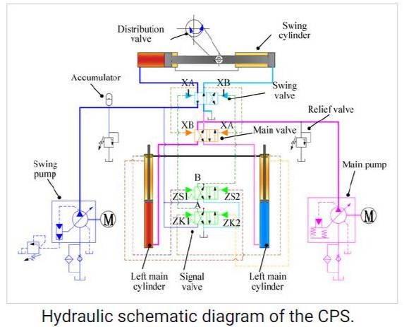 كما يوضح الشكل 2، فإن النظام الهيدروليكي المنوط به عملية إيصال المجبول البيتوني إلى النقطة المطلوبة فهو مكون من العناصر الآتية: