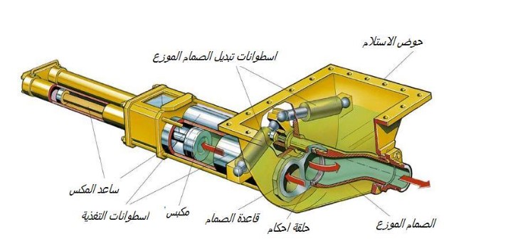 6- صمام التوزيع Distribution valve: هو الصمام الذي يوصل الأسطوانة المملوءة بالمجبول مع خط النقل، ووصل الأسطوانة الفارغة مع حوض التغذية بالمجبول.