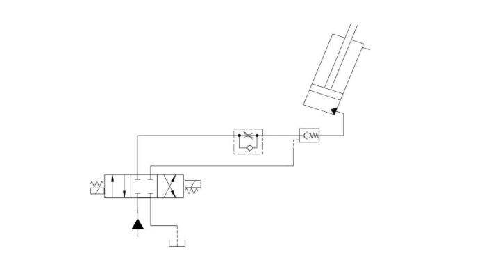 1- اسطوانة رفع الذراع الموزع (البووم) وهي أسطوانة أحادية الفعل وظيفتها إعطاء البووم الزاوية – في المستوي الرأسي – اللازمة للعمل، والشكل 5 يبيّن مخطط الجزء من الدارة الهيدروليكية الخاص بها.