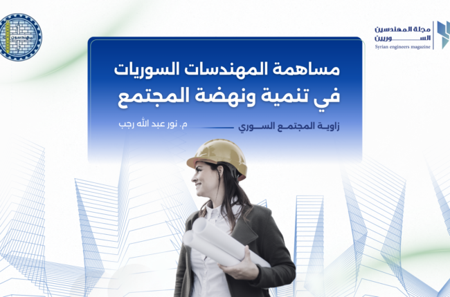 المهندسة نور عبد الله رجب مساهمة المهندسات السوريات في تنمية ونهضة المجتمع كاتبة المقال: م. نور رجب أولاً: مشاركة المهندسات السوريات في المجتمع: إن وجود المرأة السورية في مختلف مجالات الحياة هو مفتاح الخير والبركة…