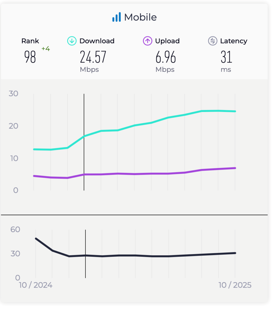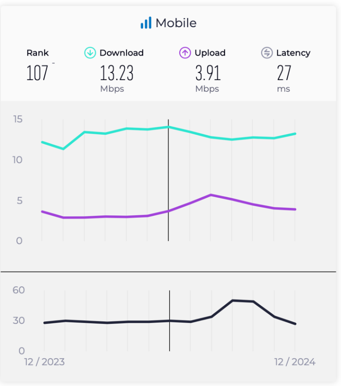 بحسب اخر المعلومات البيانية المنشورة من شركة Ookla والتي تشمل الى شهر ايلول من سنه 2025 والمبينة بالرسم توضيحي 3، بلغ متوسط سرعة تنزيل البيانات (Download) بسوريا في الشهر العاشر من سنه 2025 حوالي 24ميجابت بالثانية ، بينما سرعة التحميل (Upload) تبلغ حوالي 7ميجابت بالثانية، مما يضع سوريا في المركز ال 98 عالميا.