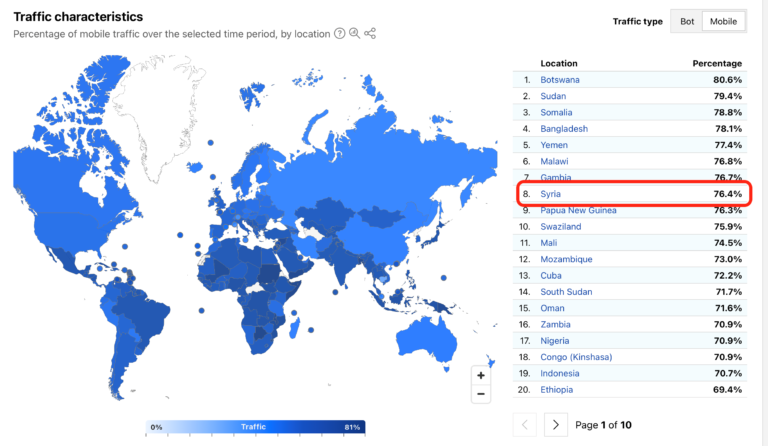 هذه النسبة العالية تجعل سوريا في المركز الثامن بين دول العالم في نسبه الاعتماد على شبكات الاتصالات للوصول للإنترنت، كما موضح بالرسم توضيحي 6، وهذا يؤشر أيضا الى ضعف البنية التحتية للاتصالات بالألياف الضوئية وغيرها من التكنولوجيا المعتمدة على الموصلات. لذلك توفر شبكات الخليوي طريقة بديلة لتصفح الإنترنت.
