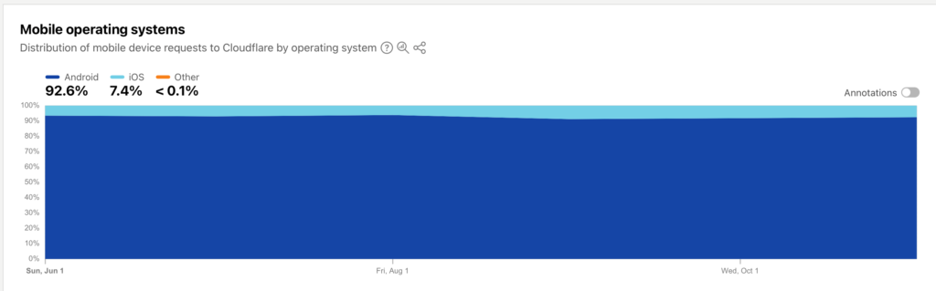 تظهر بيانات شركة (Cloudflare) أن الغالبية العظمى، حوالي 92٪، من أجهزة الاتصال في شبكة الخليوي السورية تعمل بنظام تشغيل Android، بينما يعمل الباقي بنظام تشغيل iOS، كما موضح بالرسم توضيحي 4.