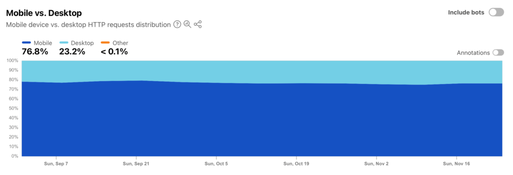 توضح بيانات شركة (Cloudflare) نسبة متصفحي الإنترنت بناءً على نوع الجهاز، سواء محمولًا أو حاسوب مكتبيًا أو محمولًا.